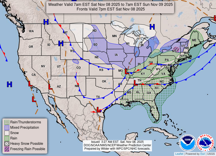 The central United States is getting an early taste of winter as the cold air outbreak we have been talking about the last couple of days starts to evolve (click here for more details from yesterday’s post). Snow and mixed precipitation will be fairly widespread today across the upper Midwest and Great Lakes, with heavy lake effect snow developing off of Lake Superior. Scattered showers and thunderstorms are expected in the southeast, with a few severe storms possible in the Carolinas and northern Georgia.