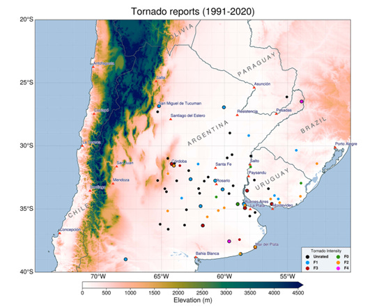 The graphic above shows tornado reports over the last 30 years is from a 2023 paper by a team of scientists at Colorado State University examining the environments in which severe thunderstorms and tornadoes form in this region of the world. This Pampas region of South America has a somewhat similar geography to the Plains region of the United States as far as thunderstorm formation: moisture comes into the region from the north and northeast off the Atlantic, while cold, dry air aloft comes in from the west off the Andes above this moisture to yield an unstable atmosphere supportive of intense thunderstorm activity.