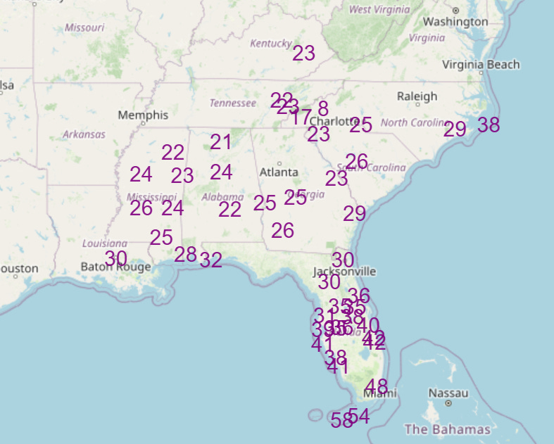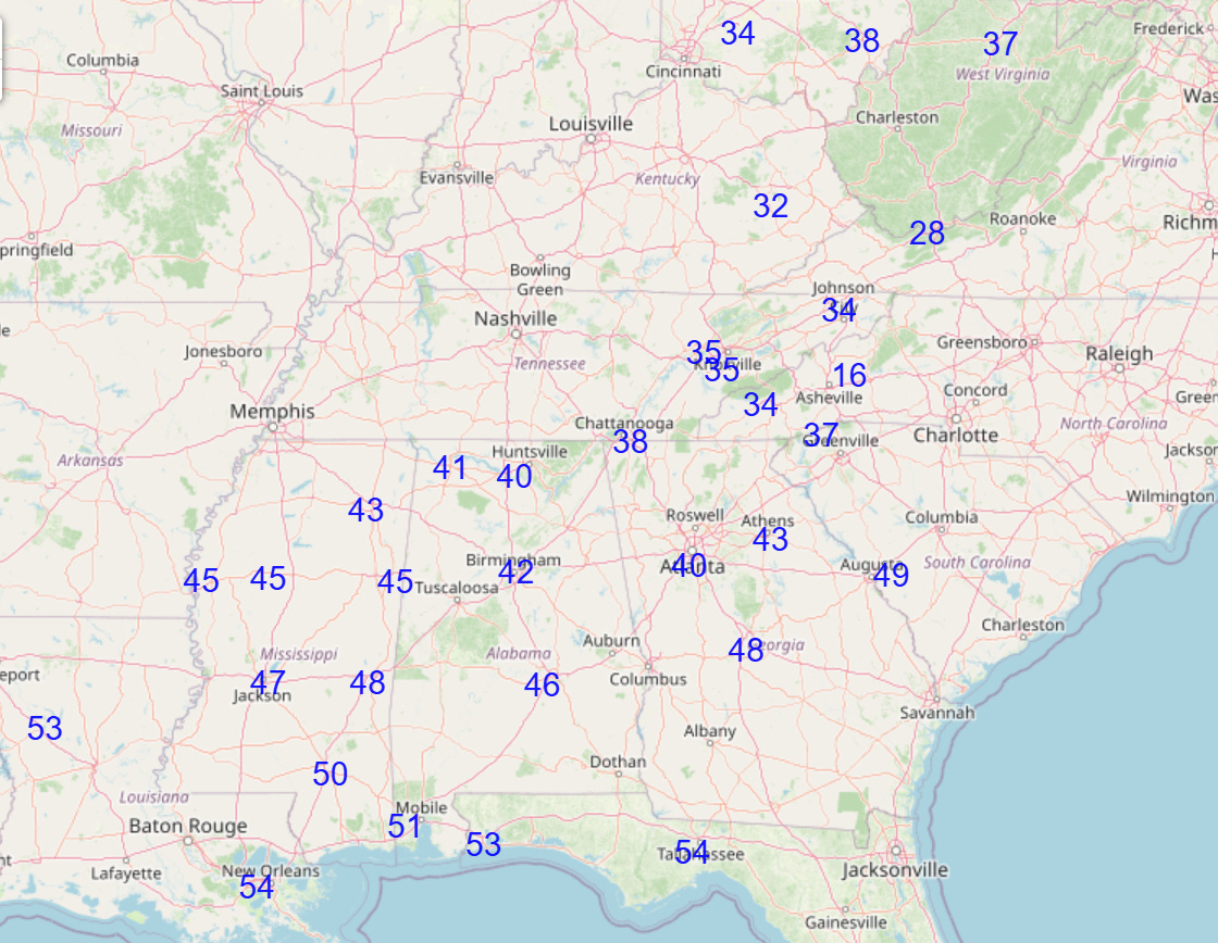 Numerous record cold temperatures, both cold maximum temperatures on Monday (top graphic) and record lows on Tuesday morning, are anticipated over the southeast quarter of the country. Again, while this will be an unusual, record breaking cold snap, it will be short lived, with much warmer conditions building in from the west in the middle to latter part of the week.