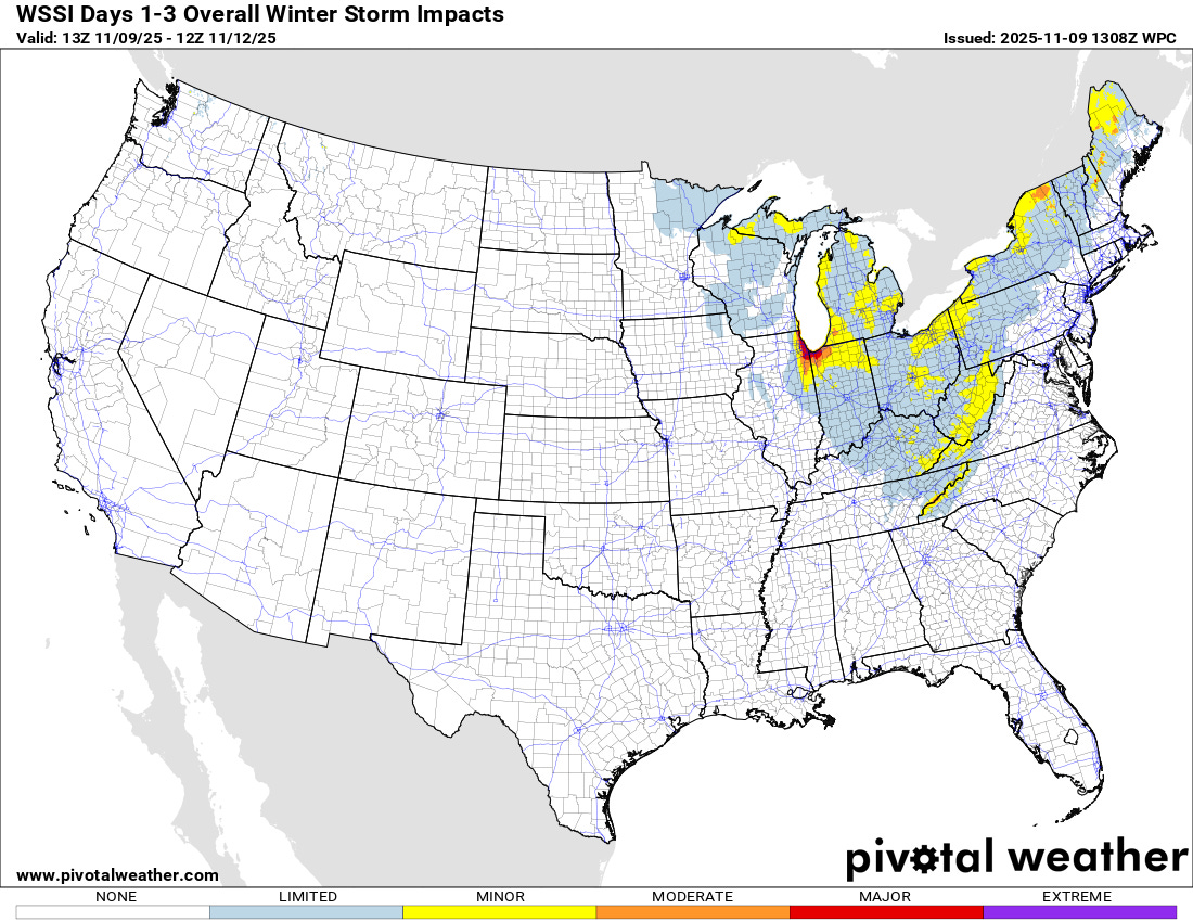 Those strong, cold northerly winds will also bring bands of significant lake effect snow to favored regions downstream of the lakes the next couple of days. As the Weather Prediction Center Winter Storm Severity Index (WSSI) shows, the most significant impacts from these lake effect snow bands look to be in the lee of Lake Michigan, where north-northwest to north-northeast winds will cause lake effect bands to impacts the Chicago area as well areas such as South Bend and into southwest Lower Michigan. Winter Storm Warnings (see map above) are in effect as lake effect snow bands will cause hazardous driving conditions with poor visibility and rapid snow accumulation, with the potential for up to a foot of snow where lake effect bands are most persistent. Winter storm warnings are also in effect for parts of the central Appalachians where northerly winds from the Great Lakes will carry moisture up the mountains, resulting in heavy snow at higher elevations.
