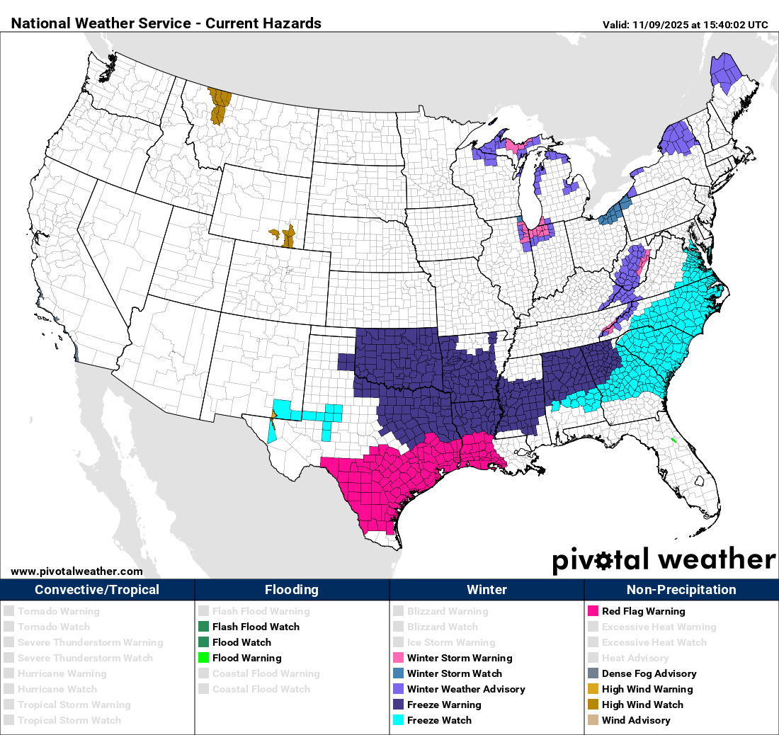 Unseasonably cold air will continue to push south into the central and eastern United States today, and freeze warnings and watches are in effect for much of the southern United States from Texas east. Additionally, strong, dry northerly winds will create dangerous wildfire conditions across much of south Texas and western Gulf Coast region today, and red flag warnings are in effect for these areas.