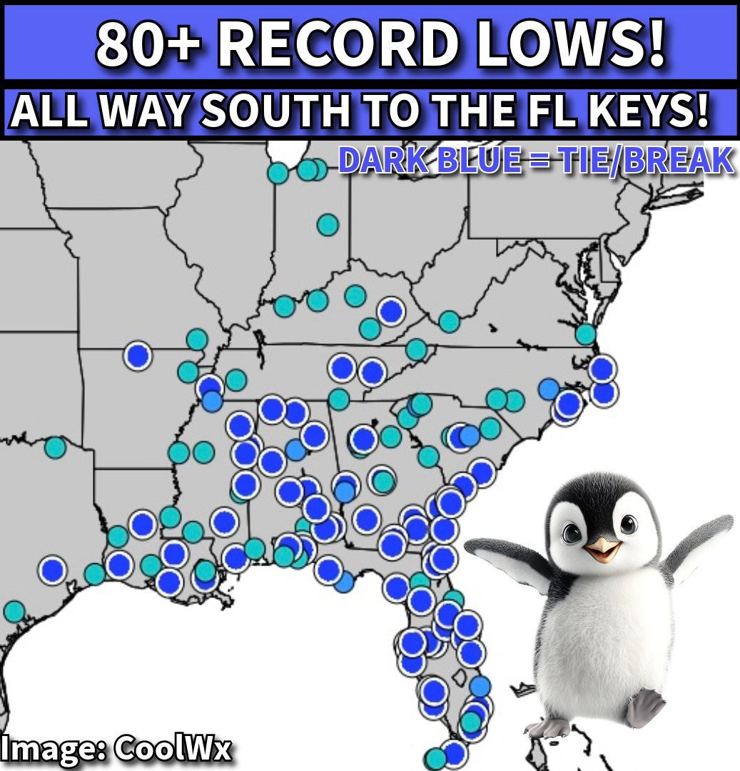 The big weather story this morning is the widespread record cold over the southeastern quarter of the nation as shown in the map above courtesy of CoolWx and Jeff Berardelli. More than 80 record lows were tied or broken this morning. A freeze occurred as far south as northern Florida, and south Florida saw morning lows in the 40s.
