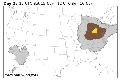 However, we are now within the time range of high resolution modeling, and even though these models show favorable parameters for an evolution like the AI forecasts are showing, none of these models develop the necessary squall line, and as a result they show little risk of severe weather. For example, the NCAR AI day 2 severe weather forecast based on the morning High Resolution Rapid Refresh model shows very limited severe weather risk over the region. As of now, the Storm Prediction Center has maintained a marginal (level 1 of 5) risk.