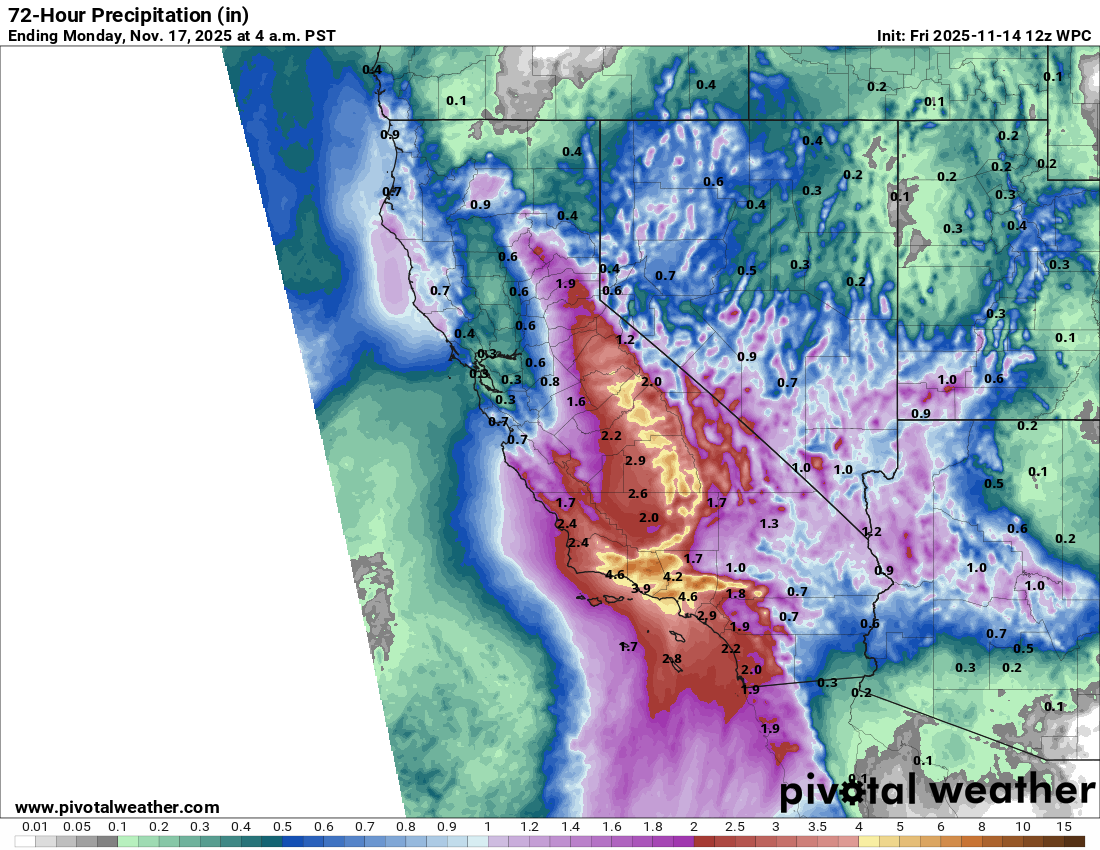 Rainfall totals of 6-10” are possible through the weekend across the terrain of southern California, particularly in the Los Angeles vicinity, with heavy precipitation also expected to extend northeast into the Sierra Nevada. Flash flood watches are now in effect for most of southern and central California, and winter storm warnings are in effect for the higher elevations of central California where heavy snow will continue.