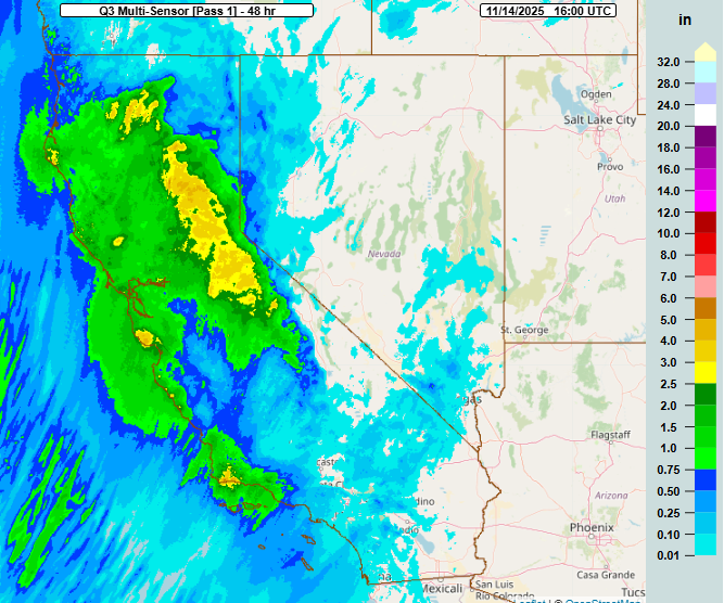 California continues to be the focus for active weather in the US today, as the upper level low pressure system that brought heavy precipitation (48 hour MRMS precip estimate shown above) to northern California, particularly the Sierra Nevada, shifts south.