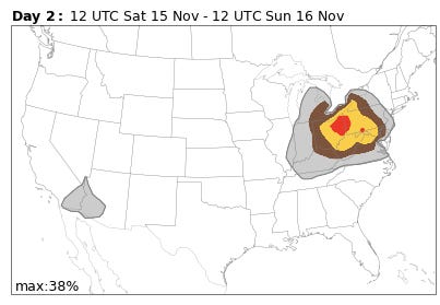 Meanwhile, we continue to watch an interesting forecast situation for the eastern Great Lakes and upper Ohio Valley for Saturday. The National Center for Atmospheric Research (NCAR) AI severe weather probability forecast based on the European AI model ensemble (top graphic) and Colorado State University AI forecast based on the US Global Ensemble Forecast (GEFS, bottom graphic) both show increased threats for severe weather in the region Saturday afternoon and evening. Given the overall forecast scenario, this would likely be in associated with a squall line along a cold front, with damaging straight line winds the main threat.