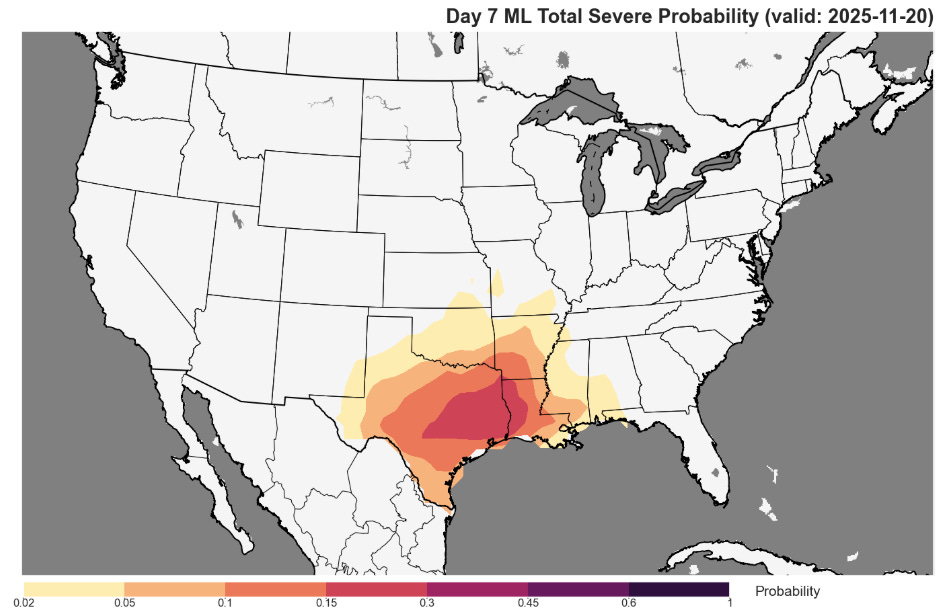 The overall pattern into next week continues to look potentially more active for severe weather. However, there are still significant differences in even the various ensemble forecasts for the basic atmospheric setup next week, and as a result the different AI severe weather probability systems have differing solutions for the magnitude and timing of the threat. They do suggest increased risk though (NSSL/SPC day 7 AI forecast based on the GEFS shown for illustration), and given that this is a climatologically more favored period for severe weather in this region, it is worth watching.