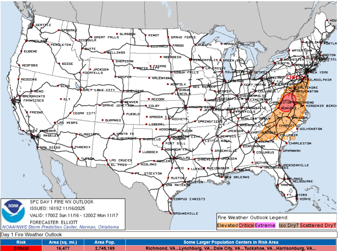 In the wake of a cold front, gusty and dry northwest winds will create a rather unusual critical fire danger day today in the Mid-Atlantic, one of the areas that is suffering from moderate to severe drought. Red flag warnings are in effect for most of Virginia and northern North Carolina. Gusty northwest winds are also anticipated farther north with wind advisories in effect for much of Pennsylvania and southern New York. Heavy lake effect snow showers are also anticipated downwind of lakes Erie and Ontario.