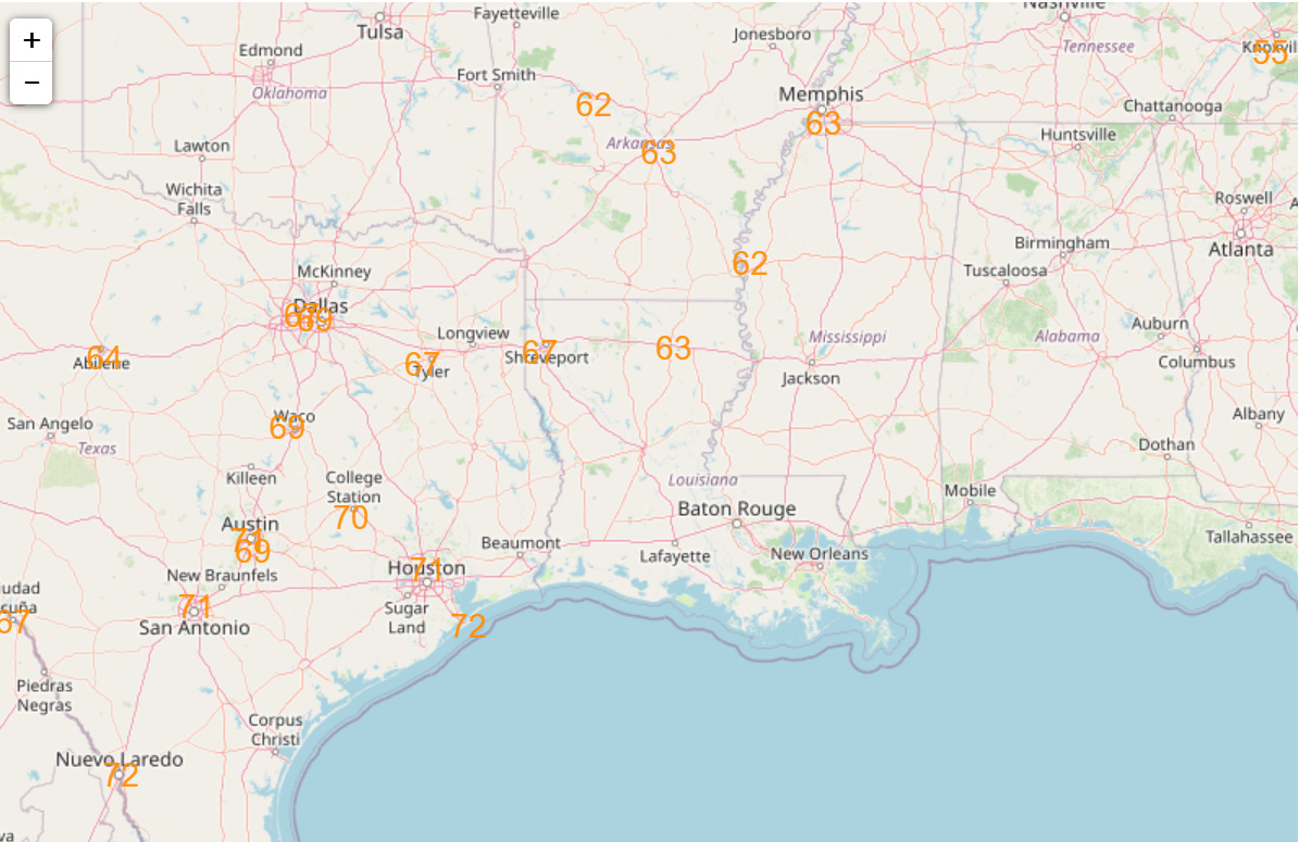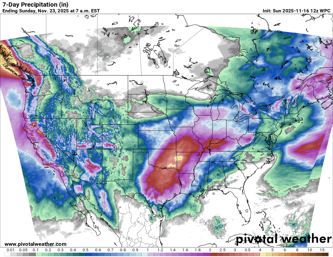 With unusual warmth and moisture, record warm minimums will also be widespread, with Wednesday (shown above) looking to the peak extent of these. Low temperatures in the 70s in south Texas are more typical of summer than the last half of November, when normal lows in this region are mainly in the 50s.