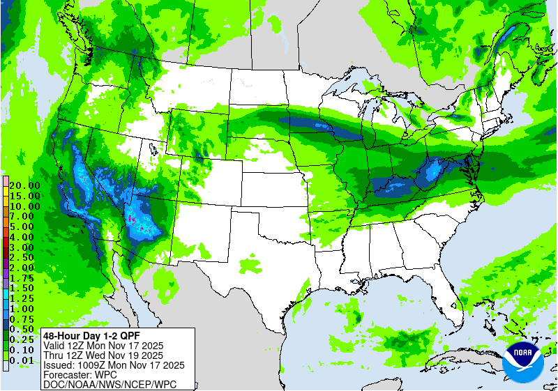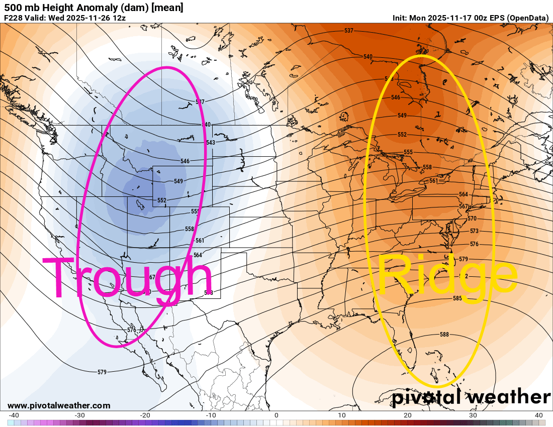 This overall weather pattern looks to persist into at least the first half of Thanksgiving week as shown by the European ensemble 500 millibar (18K ft AGL) forecast weather map for next Wednesday. There are signs that this pattern will start to break down — at least temporarily — around or shortly after Thanksgiving. Until then, though, this pattern should bring cooler and occasionally wet weather to the west, wetter and stormier weather to the central US, and and unseasonably warm weather for much of the eastern half to two-thirds of the country.