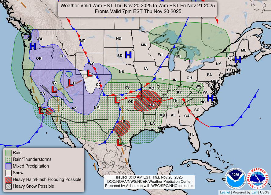 A fairly active weather day is anticipated across the country today. A storm system moving through the south central United States will continue to spread areas of strong thunderstorms across the region. Multiple rounds of storms with heavy rainfall could lead to some flash flooding, and slight (level 2 of 4) risk areas are in place as shown on the Weather Prediction Center map above (red hatched areas). WPC also has a small moderate (level 3 of 4) risk in the center of their area over Texas as heavy rainfall has already occurred in this area and additional storms could cause more significant flash flooding.