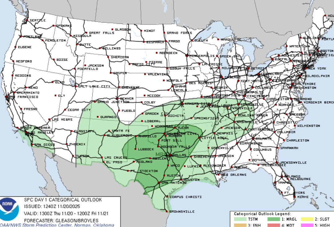 A few severe storms are also possible in this region, and a marginal (level 1 of 5) risk is in place from the Storm Prediction Center.