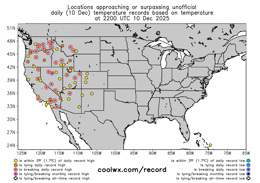 Temperatures are the other big weather story across the country, with record warmth dominating the western United States under the unusually strong middle and upper level area of high pressure across the region. Numerous record high temperatures were set across the region on Wednesday, with many more records expected the next several days.