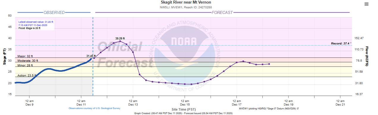The Skagit River is another river that is continuing to rise, and as I talked about in yesterday’s post the NWS was forecasting it to shatter records by 4-5 feet. Luckily, the river does not appear to be rising as much as earlier forecasts anticipated, and the forecast has been lowered at Mt. Vernon but still shows a record crest by nearly 2 feet.