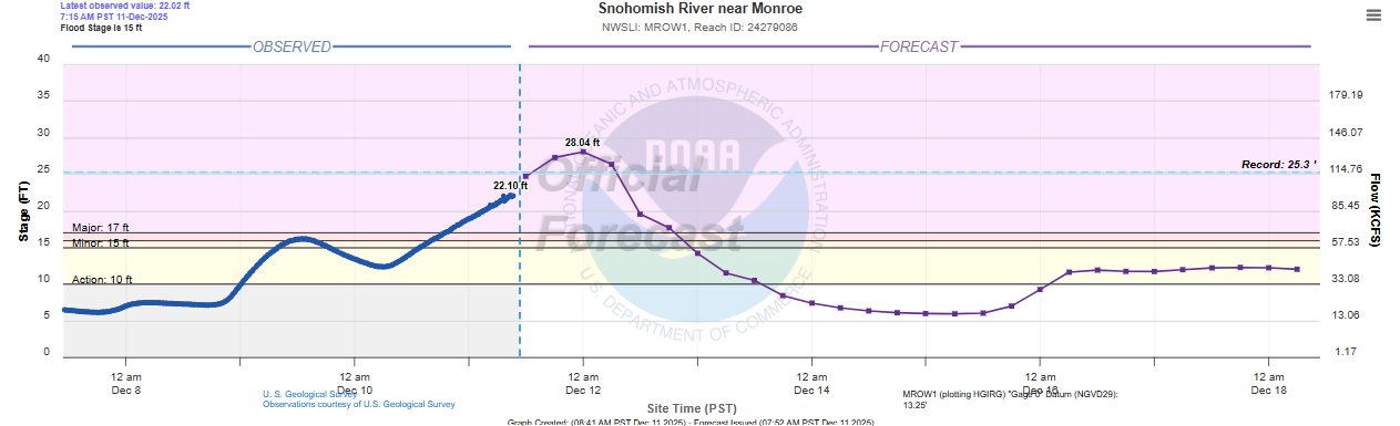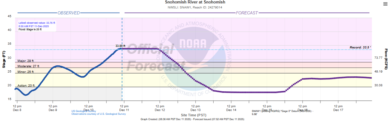 The Snohomish River at Snohomish has exceeded its all-time record (period of record goes back to at least the early 1940s). The forecast anticipates that the river is near its prolonged crest.