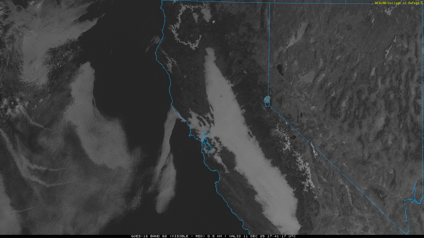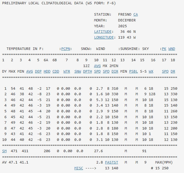 This has been the situation in this area for many days, with Fresno not climbing above 50F since December 1st, and having completely overcast sky conditions nearly every day back to the beginning of the month (column 15 in the table above, 10 means 10 of 10 for sky cover). This stagnant weather setup also yields poor air quality, and air quality advisories are in effect for this region as well.