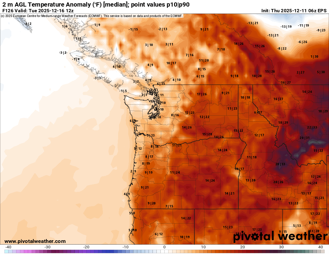 Through at least the first part of next week, temperatures are expected to remain above normal across the region (European ensemble surface temperature anomalies for Tuesday shown above), which should also keep snow levels higher than normal, which as discussed has been a significant factor in the severity of the flooding. The bottom line is while the river levels should start to fall across this region after the next 24 to 36 hours, more widespread heavy precipitation could cause additional flooding threats across the Northwest next week.