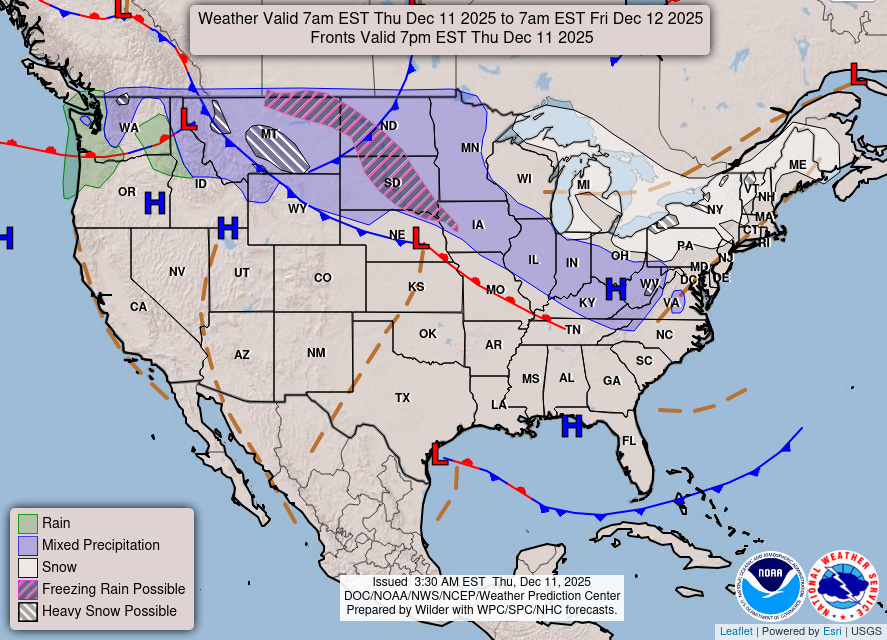 Meanwhile, downstream of the upper level high pressure in the West, colder air and occasional Alberta Clippers are yielding occasional light to moderate snowfall and mixed wintry precipitation, with some heavy lake effect snow in the eastern Great Lakes.