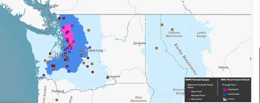 Major impacts are ongoing across the entire region. Nearly 100,000 people are under evacuation orders per the state governor’s office, and media reports that numerous water rescues are ongoing. A number of major highways are closed due to flooding and landslides, including parts of Interstate 90. Amtrak service between Seattle and Vancouver has been suspended due to flooding along the Skagit River.