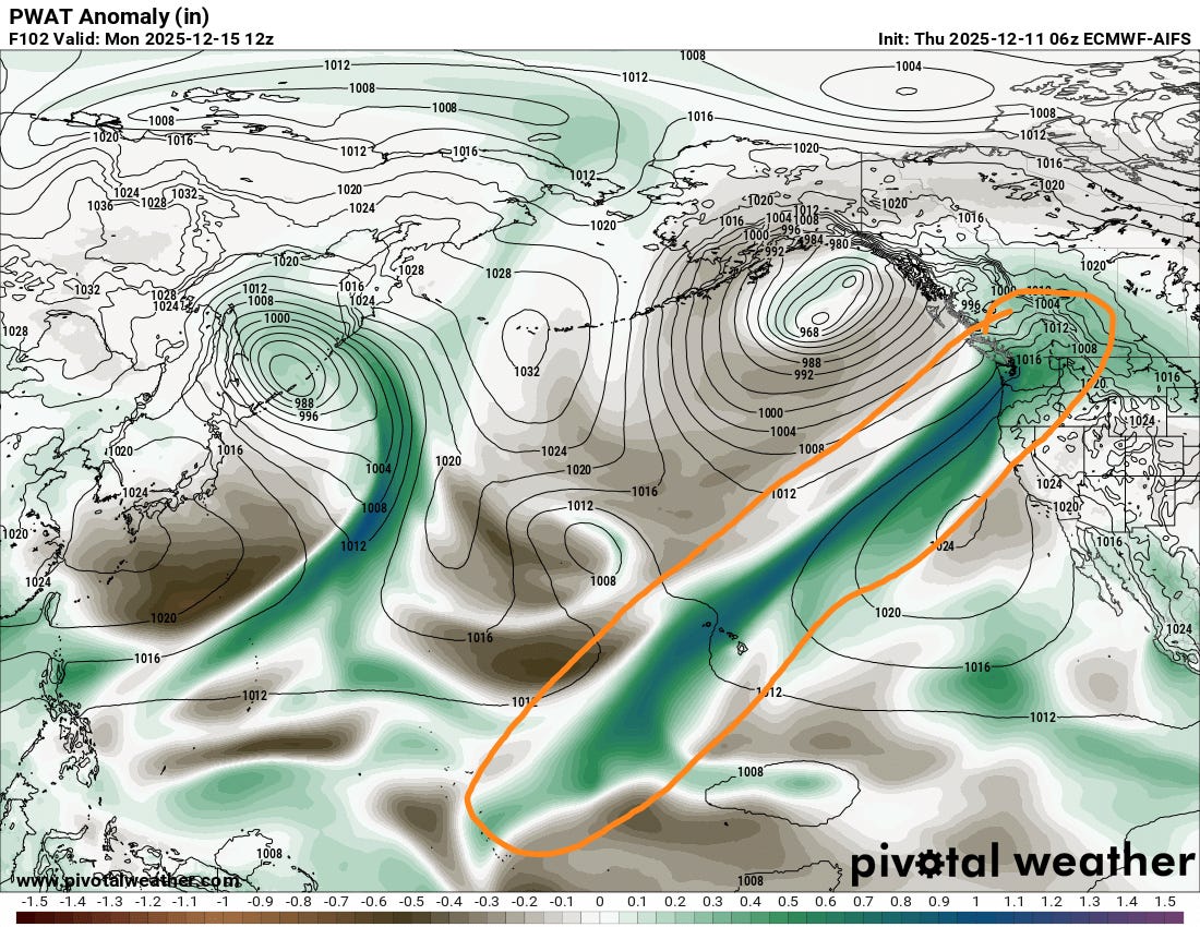 It still appears as though a break from the heavy rainfall will occur over the region Friday through Saturday. By early next week, the pattern of an “atmospheric river” of moisture originating deep in the tropical Pacific well southwest of Hawaii will take aim on the Pacific Northwest again (shown above). As strong atmospheric disturbances move through the region, more waves of heavy precipitation are anticipated. This wet pattern will likely persist much of the week.