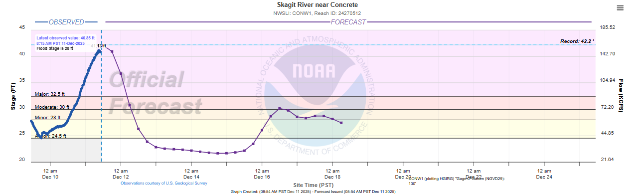 Upstream of Mt. Vernon at Concrete, the river actually looks to be cresting just below its record. Even though the Skagit is not reaching the extreme levels forecast yesterday, it is important to recognize that even at these levels extensive, serious flooding is occurring along portions of the river.