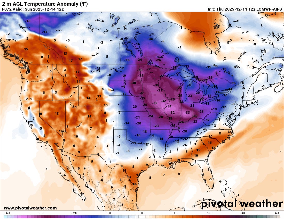 As the upper level high pressure in the West strengthens even more over the next 48 hours, this will allow arctic air over the Northwest Territories of Canada to start spilling southeast, eventually overspreading much of the central and eastern United States this weekend. Temperatures will be as much as 35F below normal in the core of the colder air over the Midwest and Ohio Valley, where some record cold temperatures are possible this weekend, particularly record low maximums on Sunday. There are signs though that the warmth in the western United States will start to build east across the country next week, bringing at least a reprieve from the cold, snowy start to the winter in the eastern half of the country.