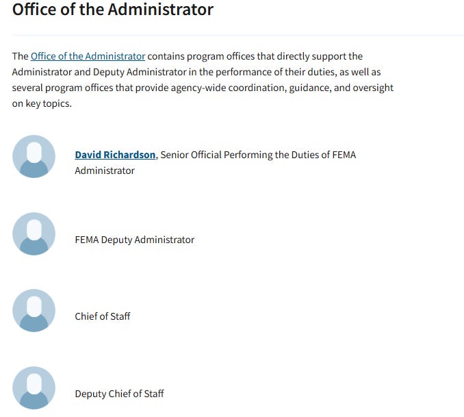 Along with this ongoing debate about the future of the agency, FEMA continues to limp along with acting, inexperienced — or no — leadership at the top of the agency. When you go the FEMA webpage dedicated to the agency’s organization and leadership, the above screenshot is what you see for the Office of the Administrator, i.e., the office of the agency director. The webpage still lists David Richardson as the “Senior Official Performing the Duties of the FEMA Administrator” even though he resigned last month, and all of the other three senior leadership positions are shown as vacant. Of the eleven senior positions at the top of FEMA listed on the website, only three are shown as being currently occupied, and two of those are with “acting” individuals. Only one position, Deputy Associate Administrator for Mission Support Tami Franklin, is shown as a permanent employee. To me, all of this is a clear demonstration of the disorganization and chaos that currently exists at this public safety agency.