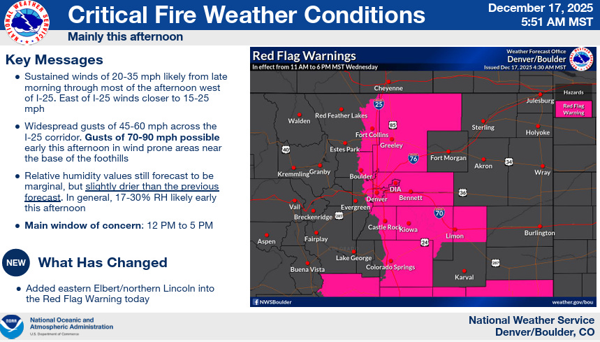 The Denver/Boulder area is at particular concern for damaging winds and associated wildfire danger today as a damaging downslope wind event is anticipated for the Colorado Front Range mountains and foothills. Wind gusts of up to 90 mph are anticipated, and power utilities are implementing proactive power cutoffs to try to reduce the likelihood of power infrastructure initiated wildfires. In a further twist of irony, the NCAR Mesa Lab is actually closed today due to this situation.