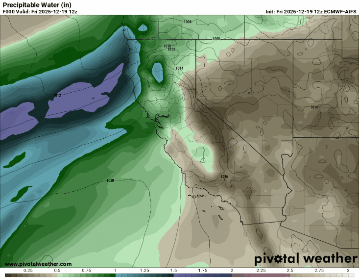 The focus for significant impacts from the continued parade of systems will be shifting to California for the next week, and particularly northern and central California. The animation above shows forecast sea level pressure (contours) and precipitable water (image) for the next 7 days from this morning’s hot off the press European AI model, which generally provides a decent blend of operational and ensemble forecast solutions for illustrative purposes.