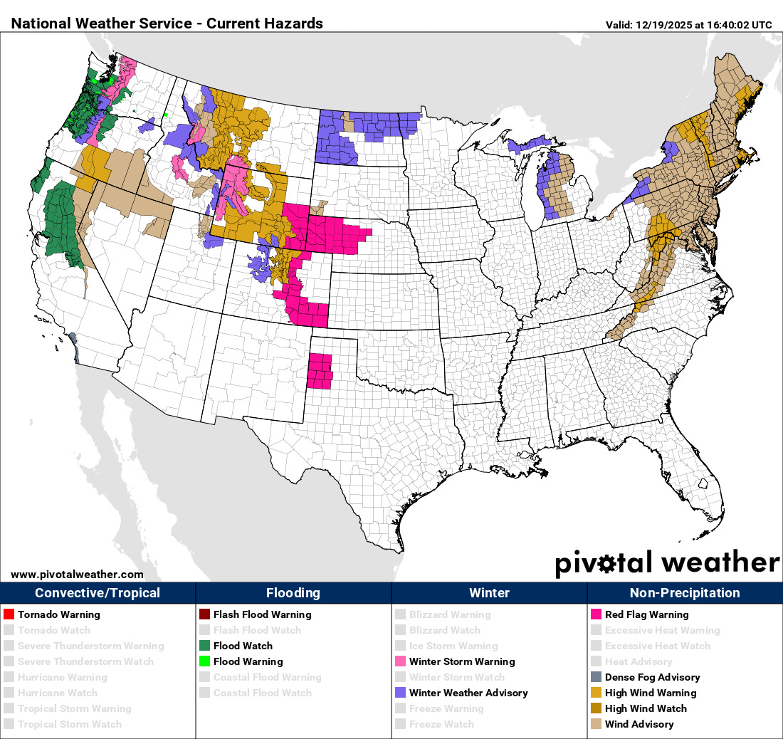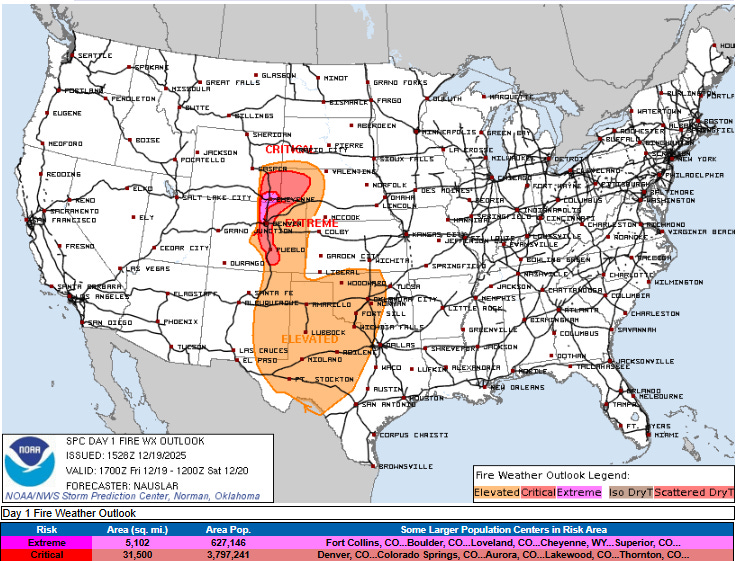 Unfortunately, Colorado is the focus today for hazardous weather reasons as well, as another intense downslope wind event is expected in the Front Range and foothills of the Rockies. Given recent dry conditions and anticipated low relative humidity, this will result in a day of critical wildfire conditions across the region, with the Storm Prediction Center focusing on the foothills region of northern Colorado and extreme southeast Wyoming for extremely critical conditions this afternoon.