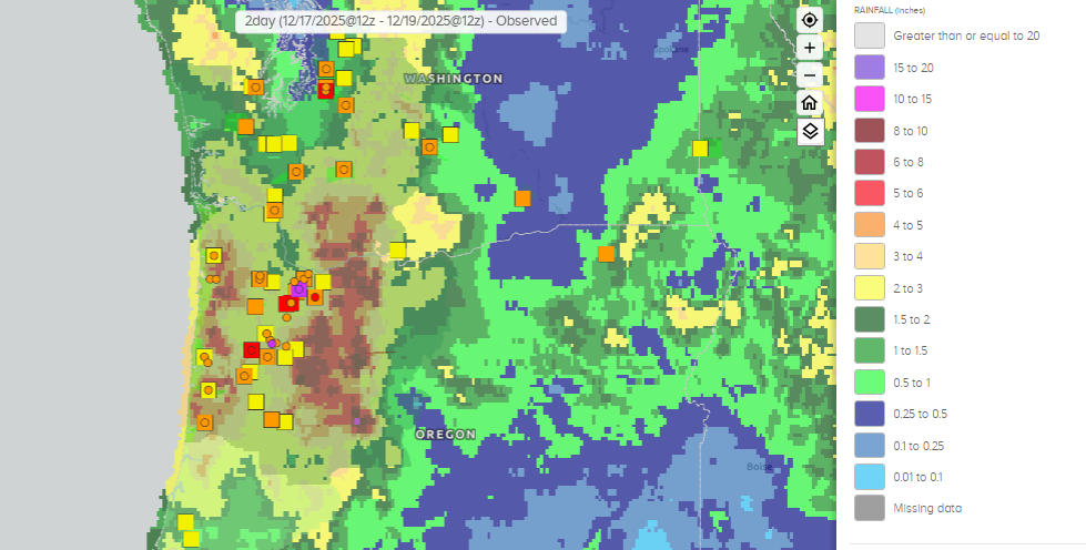 The other major weather story going into Christmas week will be the continued parade of wet storm systems into the West. Over the last 36 hours, the heaviest rainfall has been focused in western Oregon (above), with numerous rivers now in minor to moderate flood stage.