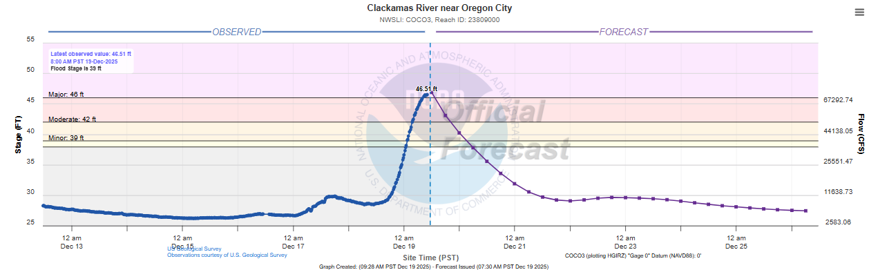 The Clackamas River near Oregon City is cresting at major flood stage, and per the NWS impact statements for this site flooding is likely impacting residences and buildings in the region.