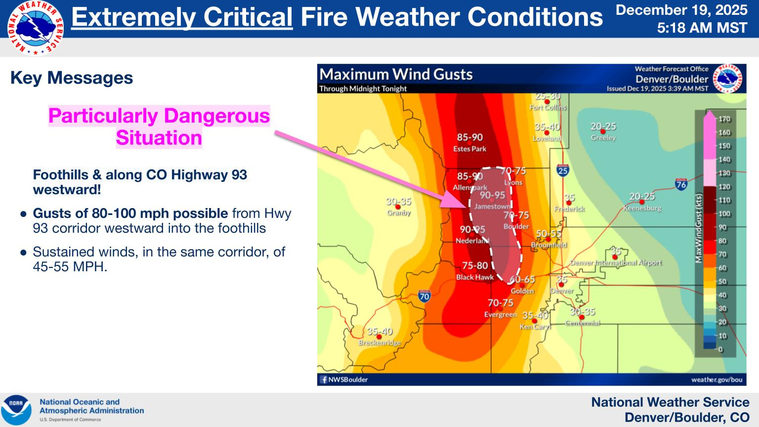 The NWS in Boulder is highlighting the areas above for their highest concern, with potential for wind gusts of up to 100 mph in areas just west of Boulder.