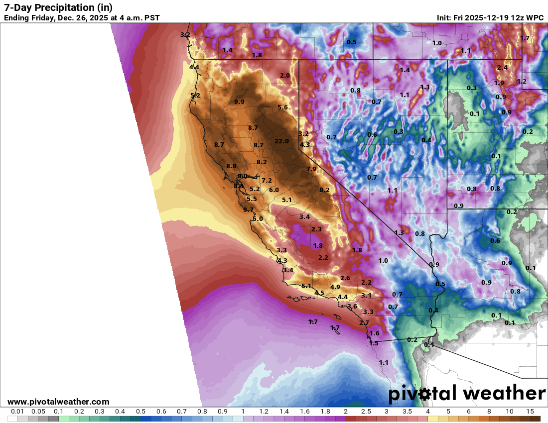 Total precipitation amounts for the next week from the Weather Prediction Center are extremely heavy, with widespread amounts of 5-10” across northern and central California, and amounts up to 2 feet (liquid, not snow!) over the Sierra. Clearly, significant flooding and eventual winter weather impacts are anticipated, and flood watches are already in place.
