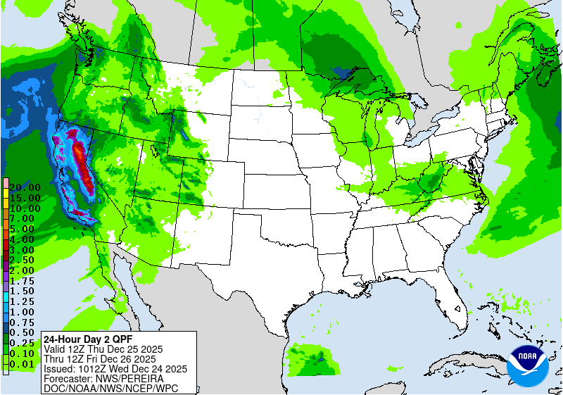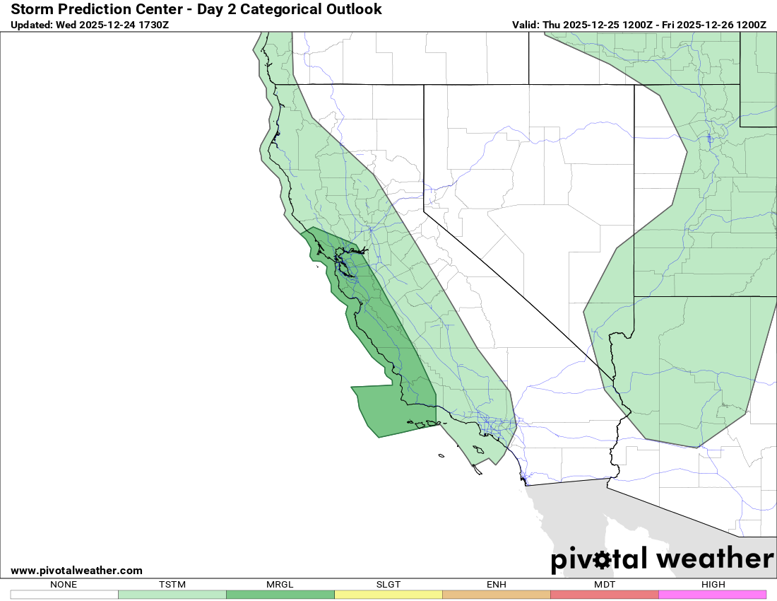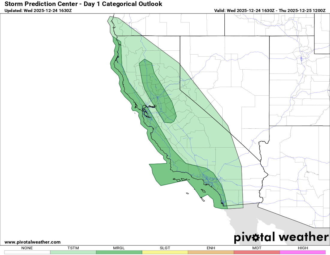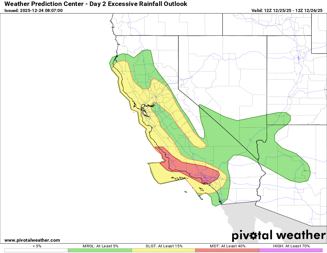 Finally, a few severe thunderstorms will continue to be possible across parts of California the next 48 hours as shown above in the outlooks from the Storm Prediction Center for today and tonight (top) and Christmas Day/Night (bottom). Damaging wind gusts and a few brief tornadoes are the main threats.