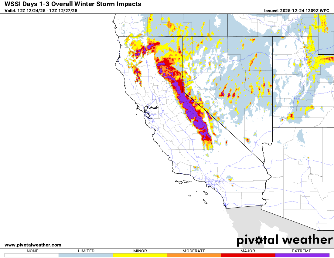 This system will also be cold enough to lower snow levels down to the 4000-5000 foot range, resulting in very heavy snow (multiple feet) at higher elevations of the Sierra Nevada and coastal ranges. Travel will become difficult or impossible across the mountains.