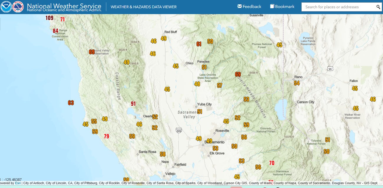 Regardless of the exact intensity, the well organized and rather intense low produced strong winds in northern California overnight, with a maximum gust of 109 mph reported at an elevation of ~1000’ MSL just southwest of Eureka. PowerOutage.us shows that nearly 150K customers are without power across northern California this morning.