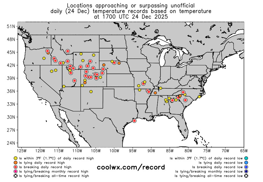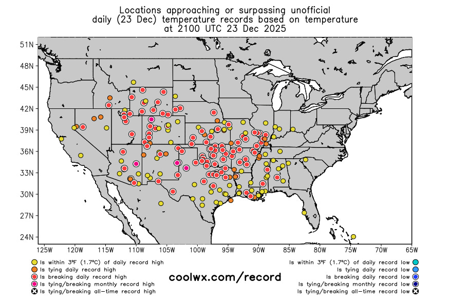 Turning now to the warmth — dozens of record warm temperatures were broken again on Tuesday with record highs shown above. With a high of 84F, Lubbock would have set a new all-time December record maximum temperature, except a new record of 85F was set on Monday. Phoenix set a new record high with 80F, and it was the third consecutive day with highs at 80F or above. As pointed out by Don Sutherland on BlueSky, this set a record for the latest 3-day stretch of 80F at Phoenix, breaking a record set just last year. The low this morning at Phoenix of 63F would set a new all-time record warm minimum for December if it holds as the low for the day.