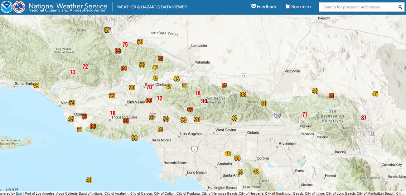 Meanwhile, as my colleague Daniel Swain posted on BlueSky, a narrow band of convection has developed along the cold front in southern California. It has produced severe wind gusts and heavy rainfall as it progresses east across the region, resulting in the NWS issuing severe thunderstorm warnings for the area.