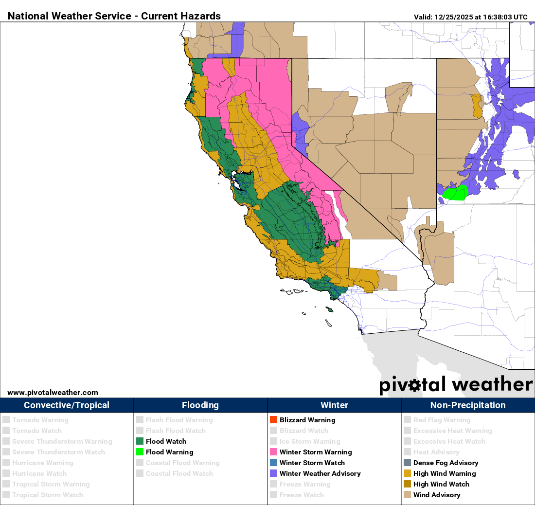 High impact weather will continue across the state today, with very heavy snow in the mountains above about 4000’, strong wind gusts (which will also impact parts of the Pacific Northwest and Great Basin), and flash flooding. Multiple watches, warnings and advisories are in effect as shown above.