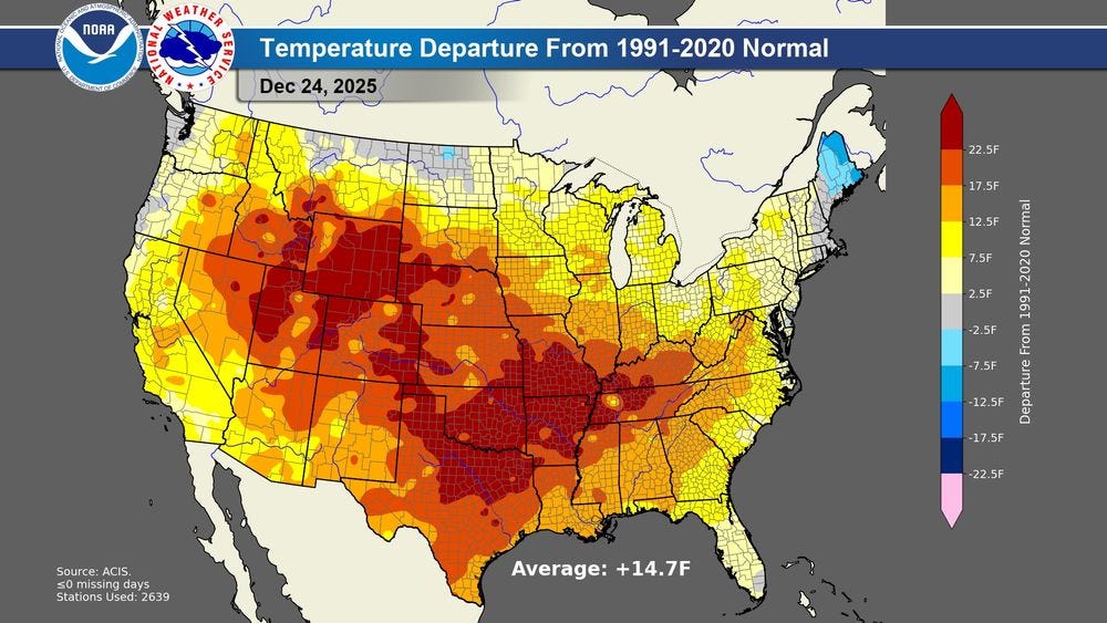 Climatologist Brian Brettschneider posted this image on BlueSky that the average national temperature for Christmas Eve was nearly 15F above normal.