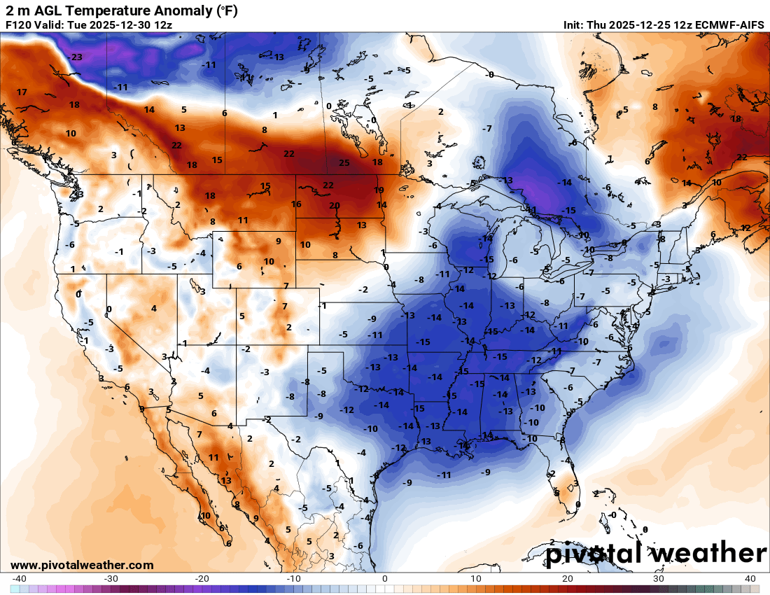 Climatologist Brian Brettschneider posted this image on BlueSky that the average national temperature for Christmas Eve was nearly 15F above normal.