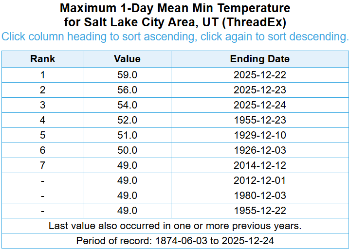 Salt Lake City has climate records back to 1874 — and incredibly the three warmest December mornings observed there were the last three mornings. The low of 59F on Monday was 7F warmer than any prior December morning — and as I discussed Tuesday, was 2 degrees warmer than the daily record high temperature.