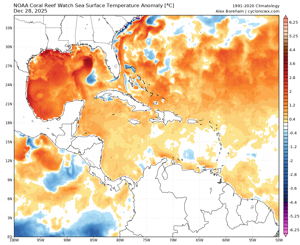 The unusually high dewpoints were likely supported by a much warmer than normal Gulf. SSTs are running 2-3C above normal — in fact, as noted by my colleague Matt Lanza in a recent post, Gulf of Mexico waters are the warmest on record for this time of year. This means that the air flowing from the Gulf will contain more moisture than normal.
