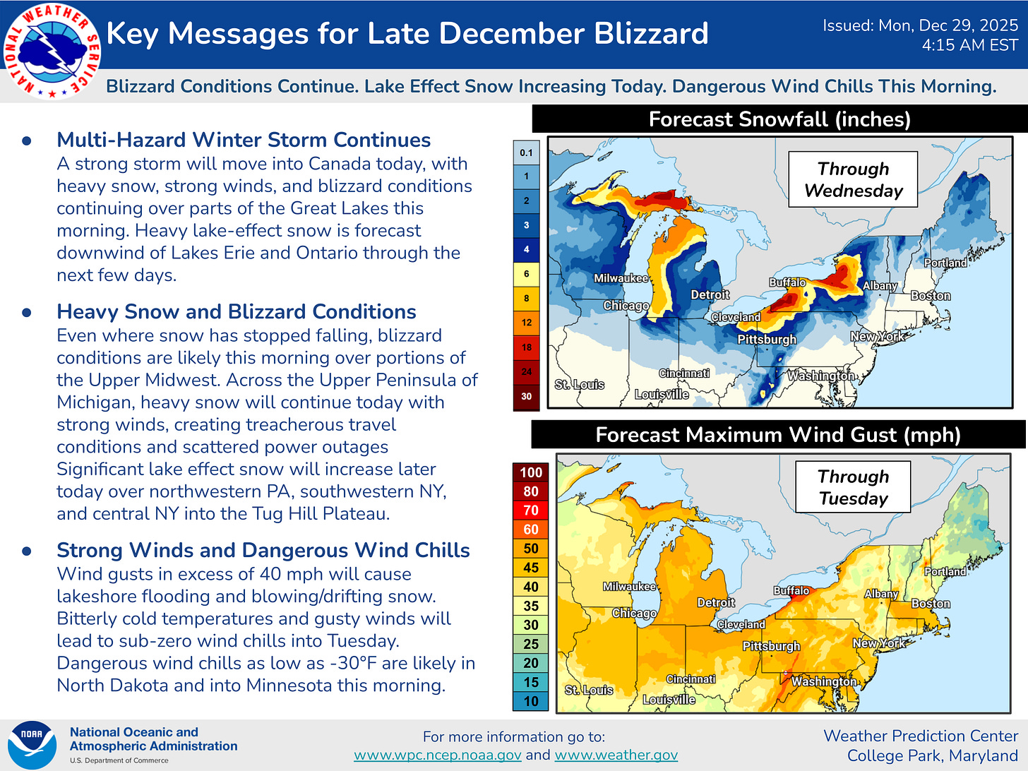 For today into Tuesday, the intense low pressure system will continue to produce strong winds in the Great Lakes and Northeast region and heavy lake effect snow downwind of the lakes. As noted in the NWS Weather Prediction Center key messages above, even where snow has stopped falling, strong winds in areas with recent snowfall will cause dangerous travel with blowing and drifting snow.