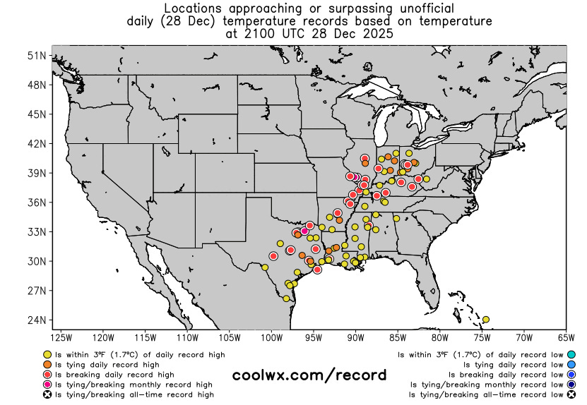 Speaking of record warmth, the last day of this impressive multi-day period of record warmth produced multiple records warm temperatures, again including some all-time December monthly records. St. Louis — with a climate record back to 1874 — broke its all-time December record high by 2 degrees with a temperature of 78F.