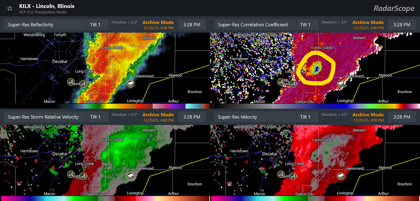 As the severe storms were organizing into a squall line across central and northeast Illinois, they produced several tornadoes. The most damaging tornadic storm appears to have been this one to southeast and east of Decatur around 3:30 pm CT. I have highlighted the location of a well defined tornadic debris signature that was evident in Doppler radar dual-polarization data. The intensity and depth of this signature suggested that significant damage occurred with this storm, and in fact a number of homes sustained heavy damage. Luckily, no injuries were reported.