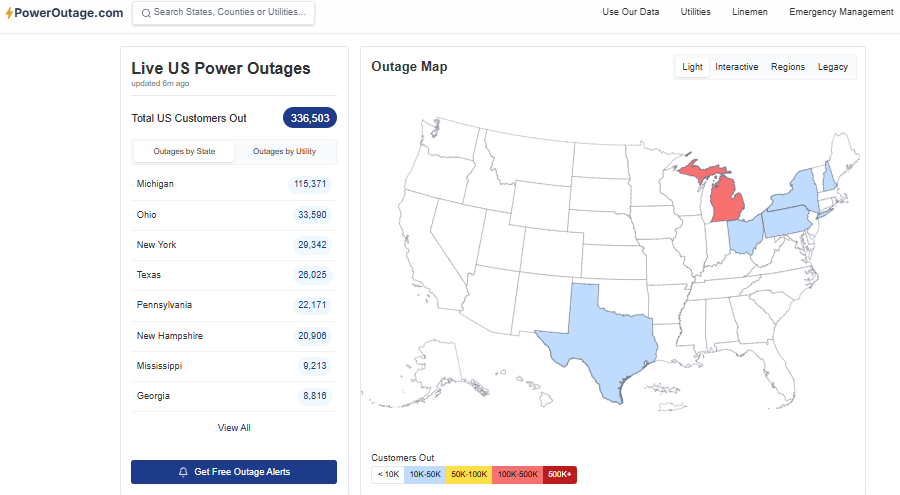 The combination of strong winds, heavy snowfall, and some freezing rain across the northern Lower Peninsula has resulted in more than 100K customers without power this morning across Michigan. In total, about 300K customers are without power in the Great Lakes and Northeast due to the high winds and wintry precipitation.