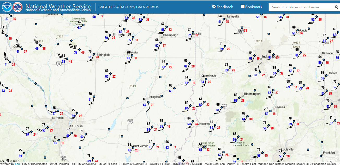 Severe thunderstorms require an unstable atmosphere, which in turn needs a warm and humid layer of air near the surface. Conditions were remarkably warm and humid in central Illinois Sunday afternoon as shown in the 2 pm CT weather map above (temperature is the top left number and dewpoint is the bottom left number for each station). Decatur — the observing site nearest to the tornado discussed above — had a temperature of 70F and dewpoint of 63F at 2 pm, much more typical of a spring day in central Illinois than late December.