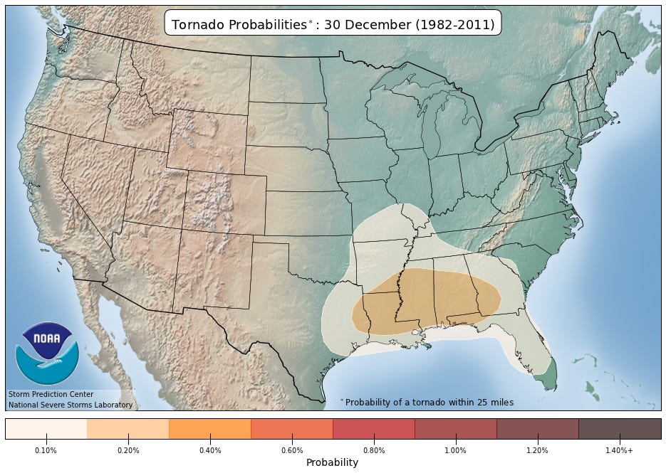 Having tornadoes this far north in late December is quite rare, as this map of climatological tornado probabilities from the NWS Storm Prediction Center for December 30 shows. However, as recently as 2021, an outbreak of tornadoes impacted central Illinois on December 15. This article about the 2021 outbreak from the Illinois State Climatologist notes that even though tornadoes in December only account for 3% of the total tornadoes in the state, they account for 8% of the tornado related fatalities.